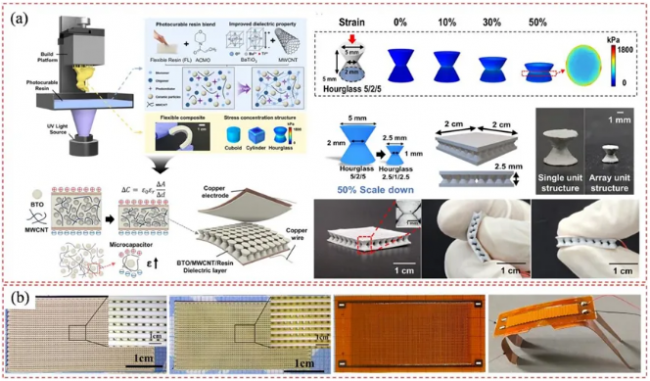 增材制造传感器具有可定制和复杂的几何形状和架构的优势,当与陶瓷材料的压电、热电和压阻特性相结合时,可实现高精度和高性能的传感应用。压电陶瓷传感器以其独特的机电耦合行为为特点,在航空航天领域发挥着越来越重要的作用。它们提供对压力、温度和振动的精确监测,广泛用于监测发动机、机身和航空航天系统其他关键部件的运行状态。由于陶瓷材料固有的脆性,柔性陶瓷的发展已成为研究的重点。为此开发了使用DLP AM的柔性陶瓷复合压力传感器,其中结合了BaTiO3将MWCNT转化为光固化树脂,以优化介电性能和机械柔韧性。如图所示,设计了沙漏形应力集中结构来提高灵敏度。有限元分析和实验证实,在较宽的压力范围内提高了线性灵敏度,证明了DLP在高性能柔性传感器中的可行性。