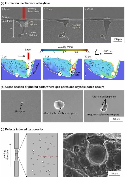 匙孔模式熔化所致的孔隙率是激光粉末床熔化(L-PBF)中另一常见缺陷。该类匙孔通常表现为球形空腔,富集于熔池底部(图4a)。尽管气孔与匙孔均呈球形结构(图4b),但气体气孔轮廓光滑,而匙孔则具有凹凸不平的轮廓界面。此类气孔尖锐棱角处更易萌生裂纹。疲劳测试试样内部孔隙缺陷引发裂纹萌生与扩展的机理示意图(图4c)表明,气孔与匙孔会严重制约成形件的疲劳性能与服役寿命。该孔隙缺陷可通过声发射捕捉与热成像技术进行检测。