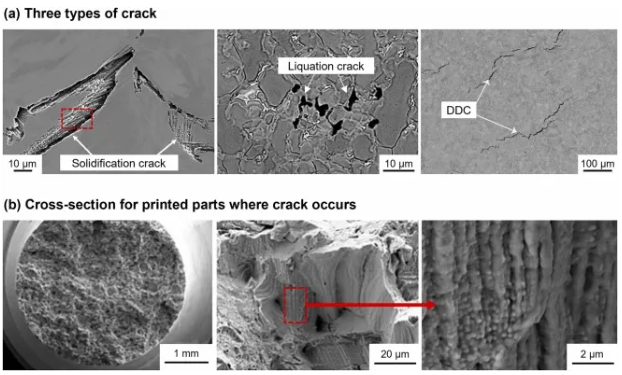 凝固裂纹、液化裂纹和高温失塑裂纹是金属 PBF 中常见的缺陷,每种裂纹都具有不同的特征(图5a)。凝固裂纹通常在凝固的最后阶段形成,原因是累积应力超过了材料的屈服强度,这类裂纹常见于成分复杂的合金中。液化裂纹通常呈现曲折形态,并伴随有由组分液化或低熔点二次析出相引起的再凝固组织。高温失塑裂纹则发生在纯固态条件下,通常出现在镍基高温合金中,表现为冷却过程中延展性降低,特别是在脆性温度区间。