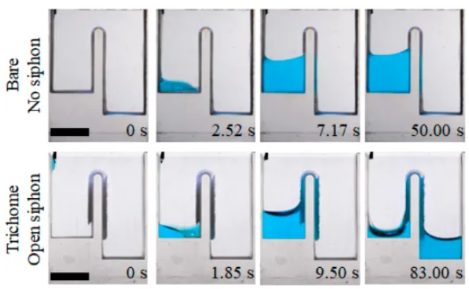 团队将毛刷阵列弯曲成n形,打造出无需封闭管道的开放虹吸系统。实验显示,其流量可达传统虹吸的3倍,且仅靠毛细力即可跨高度输水。更妙的是,通过调节入口高度差 (hₘ),还能实现流量精准控制——这一特性在微灌溉和芯片散热中潜力巨大。