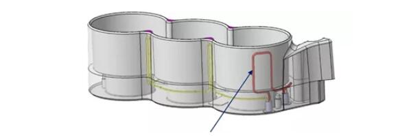 在模具冷却水路的设计方面,Exco 团队通过3D打印技术实现了压铸模具冷却水路设计的突破。典型镶件冷却通道设计的经验法则是,通道距压铸模具表面不小于0.75英寸(1.905厘米),小于这个距离都将面临失败。然而,热力学和机械仿真验证以及3D打印技术,使得Exco团队采用随形冷却通道突破这一设计极限,缩小了冷却通道与压铸模具表面的距离。