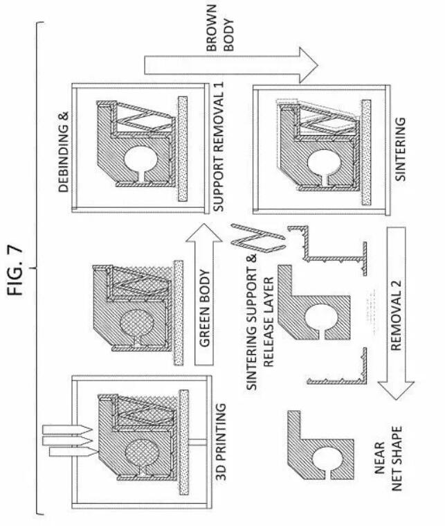 Markforged申请的专利通过将粘结剂、陶瓷材料作为分离层与支撑层一起打印完成,使得金属3D打印所获得的生坯具有更好的防止变形与热收缩控制。