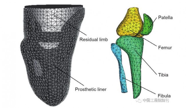 在另一项研究中,有限元分析还被用来计算残肢与接受腔接触界面上的剪切应力、软组织中的接触压力,以及摩擦相关参数。有限元方法的一大优势在于能够计算人体内部组织的生物力学参数。为了预测深层组织的损伤风险,有研究应用有限元方法分析了小腿截肢患者佩戴假肢时人体内部组织的载荷状态,分析参数包括内部组织应变、应变能密度及肌瓣上的应力等。这说明有限元方法适用于截肢患者佩戴假肢时深层组织损伤的病因分析。患者残肢骨头与软组织之间的相互作用对残肢上的应力/应变状态的影响作用也可以通过有限元方法进行分析。分析发现,骨骼与软组织之间的摩擦对残肢的应力应变有重要影响,这就要求在利用有限元建模分析类似问题时,不能忽略骨骼与软组织间的相互作用。假肢接受腔的散热也是一个长期存在的问题。利用有限元方法也可以分析接受腔内衬层的热导率对假肢散热性能的影响。该分析认为接受腔内衬层的热导率对残肢的皮肤温度产生影响。除了用于假肢接受腔的设计和评估,计算分析方法还被用于评估碳纤维足踝假体的性能。