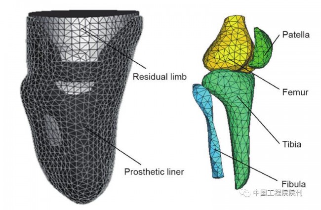 参考文献概述了有关假肢接受腔的生物力学的研究进展,介绍了用有限元建模方法研究残肢与假肢接触界面上人体组织对外界载荷的反应,并总结虽然生物力学研究有助于人们了解假肢接受腔的适配技术,但并不会引起临床实践的明显改变。有限元分析方法还被用来模拟假肢的穿戴过程。通过建立患者残肢和接受腔的有限元模型,计算得到残肢与接受腔接触界面上的纵向和周向压力及剪切力。建立假肢接受腔的简化模型,并评估其安全系数。有限元方法也在大腿假肢的生物力学分析上得以应用。为了评估大腿假肢接受腔的舒适性和适合性,研究人员建立了患者残肢和接受腔的有限元模型,对两种站立载荷条件下的界面压力进行分析,并证明两种不同假肢接受腔之间的压力分布相似。研究对计算数据与实验测量数据进行了对比,两种数据高度相似。