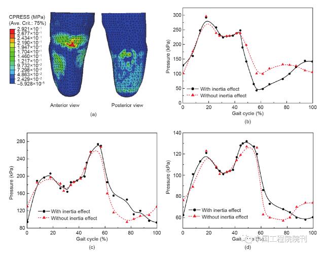 图2 残肢上的接触应力。(a)20%步态周期时的应力分布;(b)髌腱中间区域的应力峰值;(c)胫骨外侧区域的应力峰值;(d)胫骨内侧区域的应力峰值。CPRESS:接触压力。Ave. Crit. 代表对结果值相差25%以内的相邻单元进行平均。