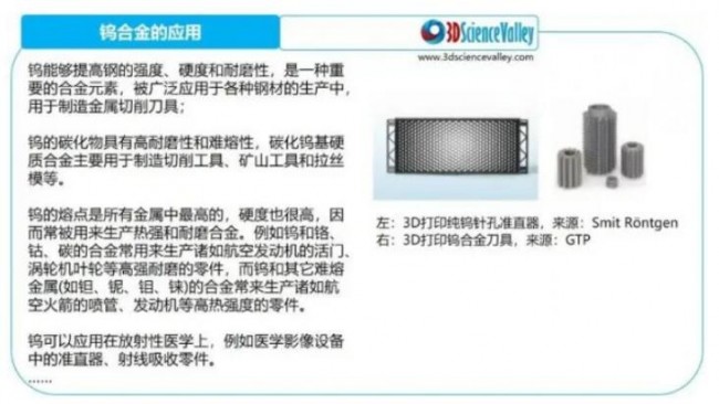 在钨金属3D打印的商业化进程方面,根据 的市场观察,世界范围内钨粉制造商GTP 正在推进两种钨合金粉末的研发,与以往涉及到的钨合金3D打印粉末所不同的是,这两种钨合金材料将用于粘结剂喷射这一间接金属3D打印技术。
