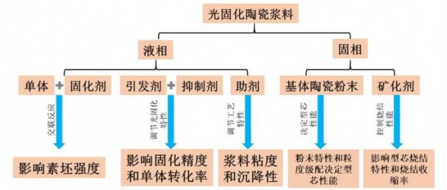 图1为光固化陶瓷浆料的组成成分及其功能,浆料主要由液相的光敏树脂和固相陶瓷粉末组成,其液相主要由通过交联反应决定素坯强度的单体树脂和固化剂(或称为交联剂)、通过调节紫外光吸收率和固化速率来调控固化精度和单体转化率的紫外光引发剂和抑制剂,以及调节浆料粘度和沉降性的其他助剂组成;其固相组分主要包括基体陶瓷粉末和矿化剂。其中难点主要集中于浆料流变性和稳定性控制、浆料固化速率的调控及陶瓷型芯烧结收缩、烧结特性的研究。