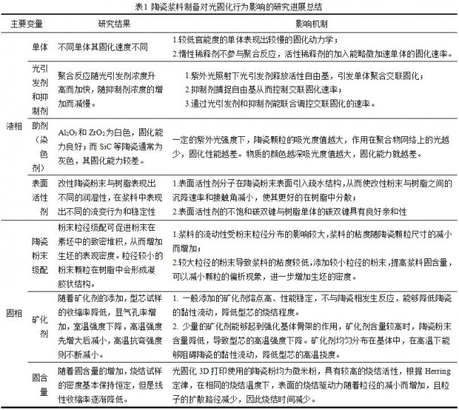 近年来研究者对光固化陶瓷浆料的固相成分也进行了大量的研究,并对其影响机制进行了讨论,结果见表2。