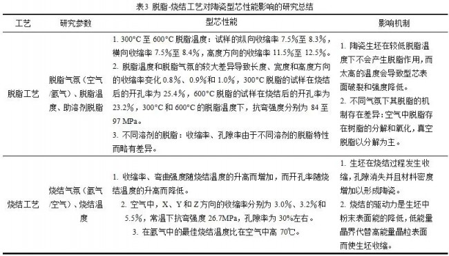 通过光固化3D打印技术制备的陶瓷型芯两个相邻层之间的界面会形成裂纹,防止生坯和烧结体的层间分层是当前光固化3D打印陶瓷型芯关注的热点问题。在烧结过程中,陶瓷中残留的碳会导致型芯裂纹的形成,除了在烧结过程中形成裂纹外,大的收缩率也对陶瓷型芯有害。为防止裂纹的形成,应控制收缩率,那脱脂和烧结的过程就显得尤为重要。为了抑制光固化打印成型体在脱脂和烧结过程中裂纹的产生,对其进行了大量的研究。脱脂的研究主要集中在脱脂气氛(空气或氩气气氛)、脱脂温度和助溶剂脱脂等方面。详细的脱脂-烧结工艺对陶瓷型芯性能影响的研究总结对比情况见表3。