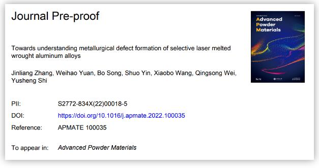 Jinliang Zhang, Weihao Yuan, Bo Song, Shuo Yin, Xiaobo Wang, Qingsong Wei, Yusheng Shi. Towards understanding metallurgical defect formation of selective laser melted wrought aluminum alloys.Advanced Powder Materials.https://doi.org/10.1016/j.apmate.2022.100035