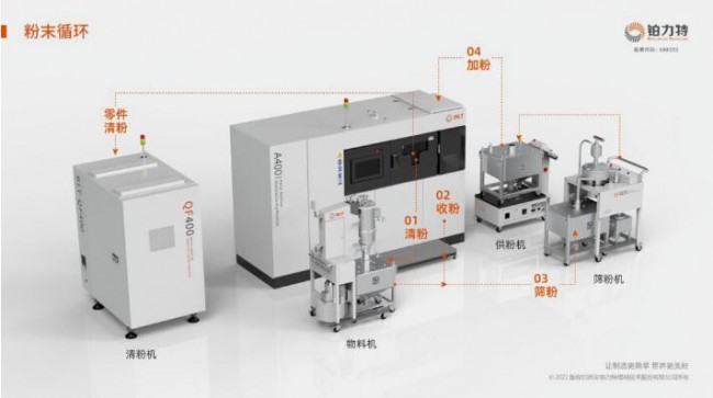 高效的粉末循环也是规模化生产中的重要环节,是影响批量生产节奏的重要组成部分。针对粉末循环全流程,铂力特推出了全套自研辅助设备,帮助客户实现粉末高效流转。