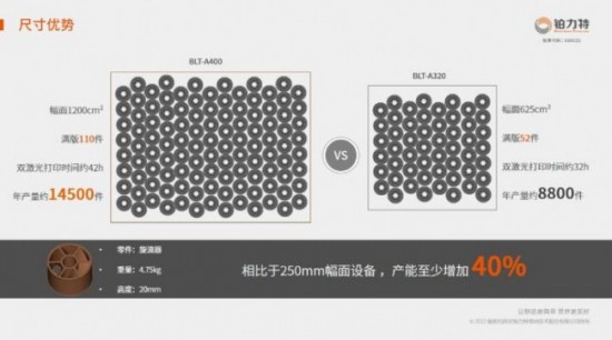 以工业生产领域常见的旋流器为例,铂力特BLT-A400满幅面可放置110件,年产量可以达到14500件(双激光,设备年使用率70%条件下),产能较同等条件下250mm幅面的设备至少增加40%。