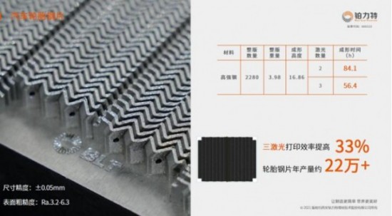 在工业领域,汽车轮胎钢片对粗糙度和尺寸精度要求比较高。BLT-A400可以实现±0.05mm的尺寸精度以及Ra3.2-6.3的表面粗糙度。满幅面两千多件钢片使用三激光年产量可以超22万件。