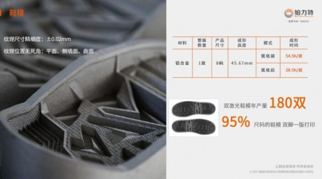 在鞋模行业,铂力特BLT-A400的400mm×300mm的幅面和鞋模行业的匹配度也非常高,可以实现95%的鞋模尺寸,双脚一次性成形,一致性更好。铂力特长期深入应用端,工艺不断迭代,从初始一双鞋54.5h的打印时间,缩短到双激光一双8码的鞋模28.5小时完成打印。无论是平面还是曲面都可以几乎百分之百还原初始模型,尺寸的精细度可以控制在±0.02mm以内。