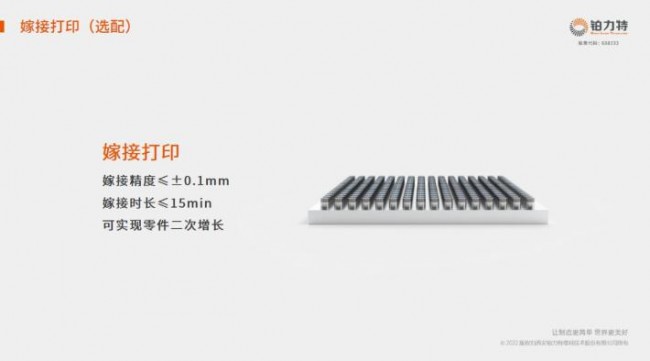 铂力特BLT-A400还可以选配嫁接打印。在传统零件平面上实现增材制造的二次加工,更充分融合传统加工和3D打印的优势。例如模具行业,通过嫁接功能加工出的随形水路,可以实现精准随形控温,提高模具冷却效果,降低生产周期。