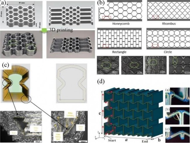 图3 3D打印CFRC(a)蜂窝;(b)三明治;(c)点阵桁架夹层;(d)晶格和(e)桁架结构的浸渍问题