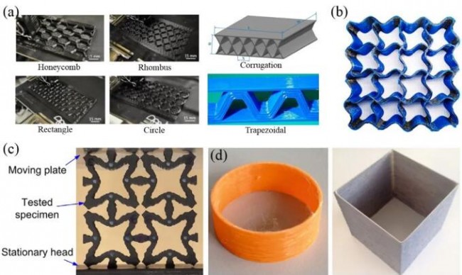 路径设计完成后,采用传统的逐层3D打印方法可制备出不同填充形状的二维CFRSs,如矩形、圆形、蜂窝、菱形、梯形、波纹等(图6(a))。新的单元形状,如波形(见图6(b)),负泊松比(见图6(c))形状,也被用于二维单元结构的设计。此外,通过3D打印工艺制造CFRC薄壁结构也开始受到关注,如图6(d)所示。