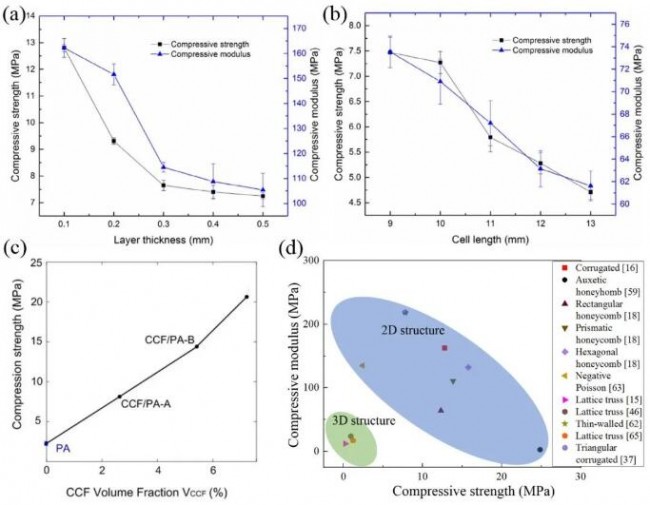 3D打印CFRS的主要目标是实现高比强度和比刚度,其中连续纤维被用于增强和调整结构的力学性能。文献中对3D打印工艺、结构变量和纤维体积分数进行优化来提高力学性能。例如,3D打印工艺参数的优化,包括层厚的减小,显著改善了复合材料的压缩性能(图8(a))。此外,CFRSs的胞元形状和密度的变化会显著影响力学性能。随着胞元长度的减小,胞元填充密度的增加显著提升了CFRSs的压缩性能(图8(b))。如图8(c)所示,随着纤维体积分数的增加,3D打印复合材料结构的压缩性能显著提高。为了更好地理解CFRSs的力学性能,我们在图8(d)总结了抗压强度和抗压模量。