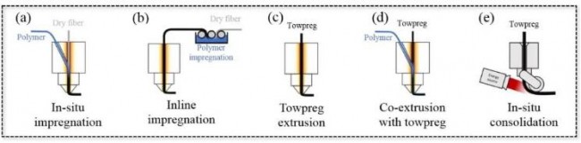 与原位浸渍法一样,在线浸渍法也采用连续干纤维,干纤维在输送到打印喷嘴之前被浸渍(图2(b))。这个过程在CFRC的3D打印中是一个复杂的方法,因为它需要多个制造步骤同时发生。与使用干纤维的打印不同,纤维预浸丝的打印是采用含有聚合物基体和连续纤维的预浸渍材料(图2)(c))。这种工艺非常方便,因为它从打印过程中分离了干纤维浸渍的复杂性。