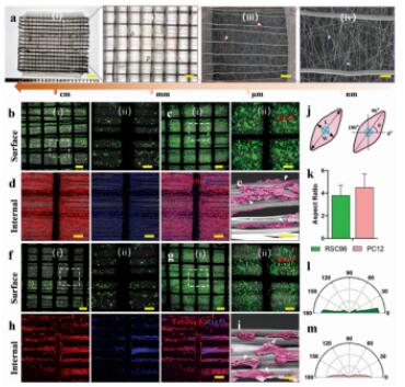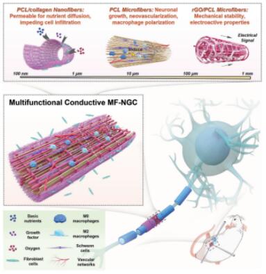 该研究使用复合增材制造技术制备的一种导电多尺度纤维神经导管,表现出良好的纤维取向性、渗透性、导电性和机械稳定性,通过大鼠坐骨神经缺损模型发现其能够快速募集血管细胞和调节巨噬细胞向M2表型转变,显著促进外周神经再生、髓鞘形成和腓肠肌等功能恢复,为周围神经损伤的治疗开辟了新的途径。