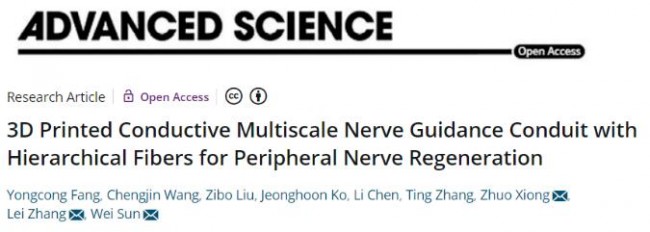 近日,研究团队的相关成果以“3D Printed Conductive Multiscale Nerve Guidance Conduit with Hierarchical Fibers for Peripheral Nerve Regeneration”为题发表在《Advanced Science》上。