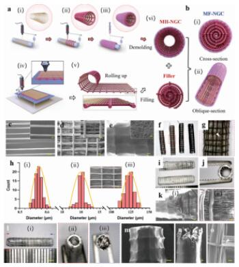 现有生物制造技术难以构建出具有仿生理化微环境的神经导管,这限制了PNI实际的治疗效果。清华大学的熊卓、张磊和孙伟教授的研究团队,合作开发了一种导电多尺度纤维神经导管(MF-NGC),为周围神经损伤的治疗提供了新思路(图1)。