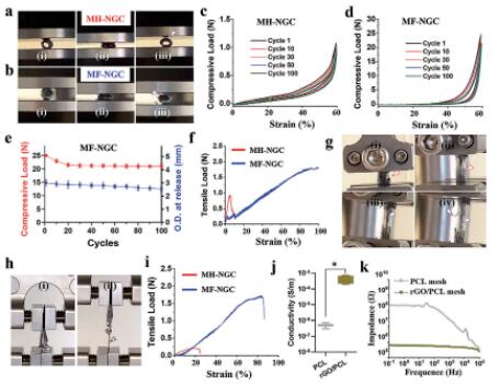 导电的MF-NGCs具有多功能性以增强周围神经再生:i)在纳米尺度上,PCL/胶原纳米纤维(直径:≈500nm)制备的MF-NGCs的外层,阻碍细胞渗透的同时有利于营养扩散和废物清除,;ii)在微观尺度上,MEW打印取向PCL微纤维(直径:≈10μm),为神经元生长提供各向异性指导;iii)在介观尺度上,由MEW打印还原的氧化石墨烯(rGO)/PCL微纤维(直径:≈125μm),提供所需的机械稳定性和导电性能,以支持神经生长。扫描电子显微镜(SEM)显微图(图2d)显示,MEW可以产生高重复性的微纤维。
