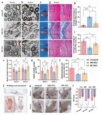 研究人员将制备的长度为15mm的MH-NGC和MF-NGC,分别植入到SD大鼠坐骨神经缺损部位,采用自体移植物作为阳性对照,分析MF-NGC支架的动物在体神经修复效果。在自体移植物组和MF-NGC组中,大多数再生轴突被厚、透明、致密的髓鞘包围。MH-NGC组髓鞘薄松散,有空泡样缺陷,是脱髓鞘的典型特征。MF-NGC组的髓鞘厚度(522 ± 85 nm)的髓鞘厚度显著高于MH-NGC组(409 ± 62 nm),且在4周时与自体移植物组(544 ± 75 nm)无显著差异。同时,腓肠肌恢复和腿部功能恢复等实验结果均表明,MF-NGC能够显著促进神经再生,与自体移植的效果相当。
