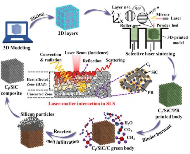 近日,中科院上海硅酸盐研究所黄政仁研究员团队开发了一种基于SLS结合直接反应熔渗工艺快速制备高性能SiC复合材料的方法 (图1)。在研究中,在碳纤维和酚醛树脂粘结剂的混合粉体中引入α-SiC骨架颗粒,基于原料组分剪裁设计开展SLS制备,系统地研究了添加α-SiC颗粒对打印粉体流动性、打印多孔素坯微结构演变和反应熔渗后SiC 复合材料力学-热学性能的影响规律,分析了复合材料微观组织形成/演变机制和材料强韧化机制。本期谷.专栏将分享该论文的要点。