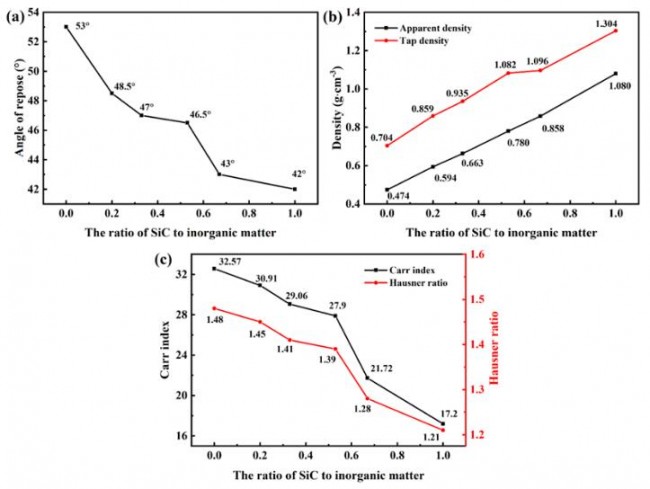 图2. 激光打印用Cf-SiC-PR复合粉体的流动性:(a)休止角;(b) 堆积密度和振实密度;(c) 卡尔指数和豪斯纳比
