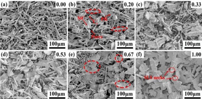图3. 不同SiC含量的复合材料素坯微观结构:(a) SiC:IM=0; (b) SiC:IM=0.20; (c) SiC:IM=0.33; (d) SiC:IM=0.53; (e) SiC:IM=0.67; (f) SiC:IM=1.