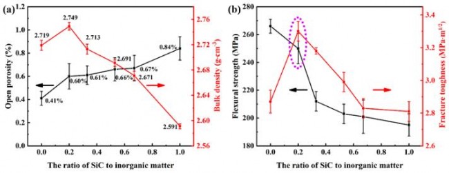 图4. SiC复合材料的室温力学性能:(a) 开气孔率与体积密度; (b) 弯曲强度与断裂韧性