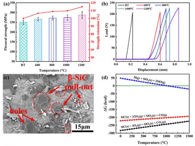 图5. SiC复合材料的高温力学性能:(a) 高温弯曲强度; (b) 位移-载荷曲线;(c) 1200oC断口形貌;(d)涉及反应的吉布斯自由能