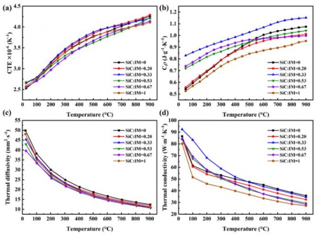 图6. SiC复合材料的热学性能:(a) 热膨胀系数; (b) 比热;(c) 热扩散系数;(d) 热导率