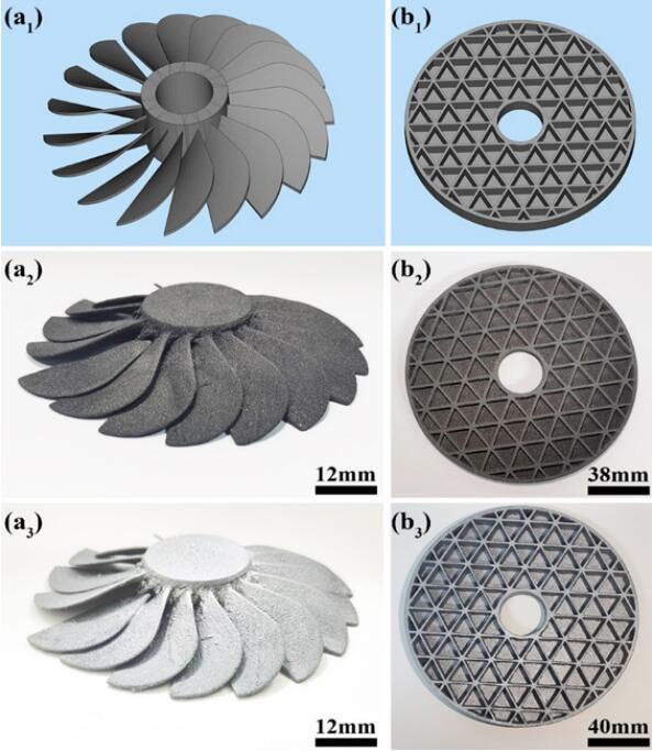 图7. SLS制备的具有复杂结构的素坯和复合材料的实物图:(a) 涡轮叶片; (b) 轻量化光学部件 (下标1、2、3分别代表模型、打印素坯和反应熔渗后的SiC复合材料)