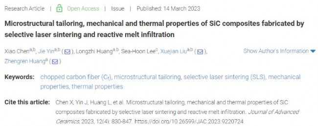 Chen X, Yin J, Huang L,et al.Microstructural tailoring, mechanical and thermal properties of SiC composites fabricated by selective laser sintering and reactive melt infiltration.Journal of Advanced Ceramics, 2023,12(4):830-847.