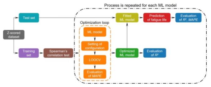 研究团队在伪随机选择的20个样本上训练机器学习模型,然后在剩余的9个样本上测试机器学习模型。通过Spearman秩相关性分析排除了不敏感的输入特征,提高了机器学习模型的效率和准确性。图1为机器学习方法预测疲劳寿命的基本流程。式1为Spearman秩相关系数计算公式。