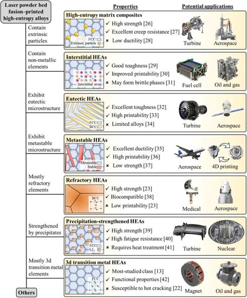 该篇综述将高熵合金分为七种类别:3d过渡金属高熵合金、共晶高熵合金、沉淀强化高熵合金、耐火高熵合金、亚稳态高熵合金、间隙高熵合金和高熵基复合材料(如图1)。研究中详细分析了每种高熵合金在不同应用中的微观结构特征及其制造过程中的技术挑战。例如,通过激光粉床熔融制备的共晶高熵合金,具有优良的打印精度和机械强度,广泛应用于对力学性能和轻量化有极高要求的工程领域。