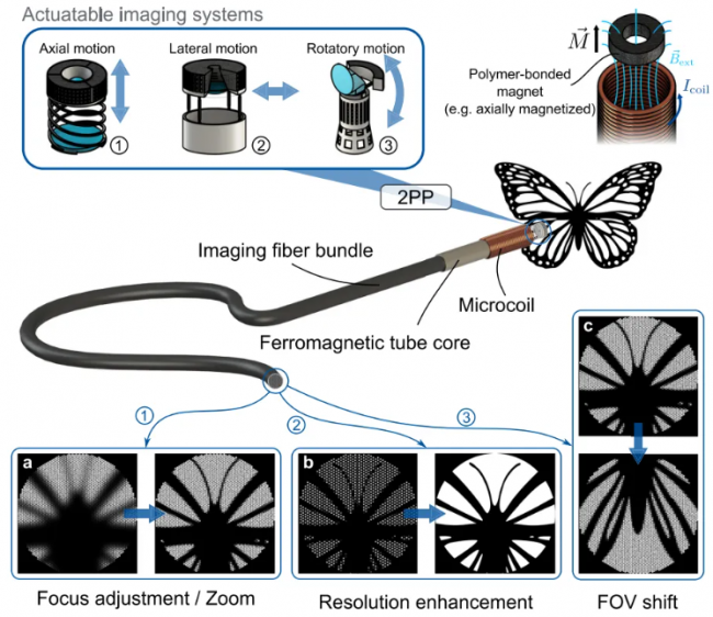 研究中,团队利用双光子聚合技术(2PP)制造了超紧凑的3D打印内窥镜微系统,强调了该方法在小型化医疗器械设计中的潜力与优势。研究者在内窥镜末端集成嵌入式电磁微线圈,并通过其激励聚合物基磁材料实现微光学元件的轴向、横向或旋转位移,从而实现成像系统的变焦、分辨率增强及视场扩展。这一技术的关键在于使用Nanoscribe公司的设备,这使得实现复杂的自由形状光学元件成为可能,而无需繁琐的微组装过程。最终,所展示的所有系统直径均低于900微米,标志着可驱动的内窥镜设备实现了里程碑式的进展。