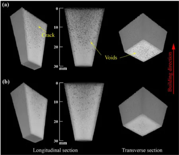 图10. 截棱锥组件的CT结果:(a)使用恒定工艺参数制造的规则样品;(b) 通过IIRI预测模型优化样本。