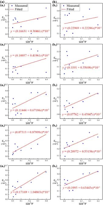 图11. 晶格应变的拟合结果εΨ对应于sin2Ψ在不同的建筑高度下,(a)规则和(b)优化的截棱锥组件:(a1)和(b1)6mm;(a2)和(b2)12毫米;(a3)和(b3)18毫米;(a4)和(b4)24毫米;(a5)和(b5)为30毫米。