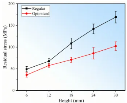 表1中的统计结果表明,样品内的残余应力随着建筑高度的增加而逐渐增加。随着样品高度的增加,先前固化的层对当前层施加了更强的机械约束。这意味着当前层在冷却过程中不能自由收缩,而是被迫适应现有结构,进一步加剧了拉伸残余应力的发展。逐层产生的热应力不易消散,而是逐渐累积。对于截棱锥组件,顶部区域更容易受到拉应力的累积,因为来自下层的约束变得更加明显。与优化后的样品相比,用恒定参数制备的常规样品在12mm高度后的残余应力以更快的速度增加,导致顶层残余应力显著升高,如图12所示。高残余应力会增加裂纹形成的风险,并对零件的机械性能产生不利影响。基于机器学习的IIRI预测模型可以指导工艺参数优化,减轻锁孔效应,有效降低部件内的残余应力。