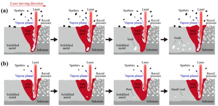 当激光束照射金属粉末时,吸收的能量转化为热量。局部区域迅速加热到合金熔点以上,形成熔池。如果能量密度足够高,材料就会蒸发,产生高温高压蒸汽,形成向上的羽流。蒸汽羽流带走了大量的热量,并可能输送未熔化的粉末颗粒和熔融金属液滴,导致形成过程中的飞溅。飞溅增加了前一层的粗糙度,损害了下一层粉末床厚度的均匀性,最终降低了竣工样品的相对密度。强蒸汽羽流产生与激光束方向相反的力,称为反冲压力。这种反冲压力增加了熔池的不稳定性,加剧了小孔效应。熔池中的动态波动导致小孔在激光移开后失稳并坍塌,在凝固的金属中留下空隙。