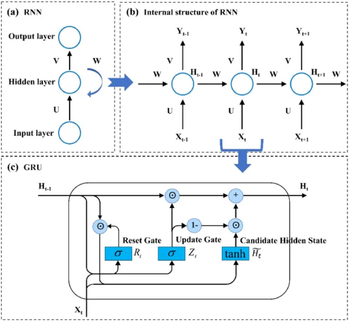 图3. 预测模型的结构设计:(a)RNN;(b) RNN的内部结构;(c) GRU结构。