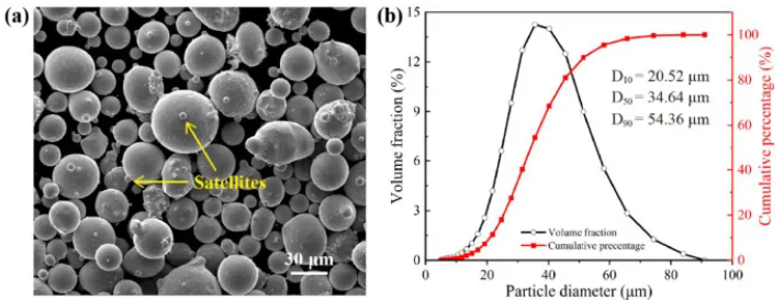 图4. DZ125粉末颗粒的特征:(a)SEM形态;(b) 粒度分布。