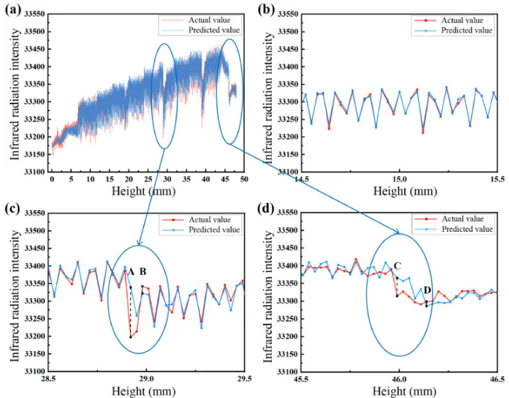 图6(c)显示了LPBF过程中意外事件对预测结果的影响。叶片部件LPBF过程中的扫描暂停导致IIRI序列值急剧下降,如图中圆圈所示,导致粉末床内的热损失。A点的预测值基于从先前形成的序列特征中学习到的长期和周期性模式,与实际值存在显著差异。然而,预测模型通过学习后续两层中的短期序列相关性,快速适应了意外事件的影响,从而在B点做出了准确的预测。