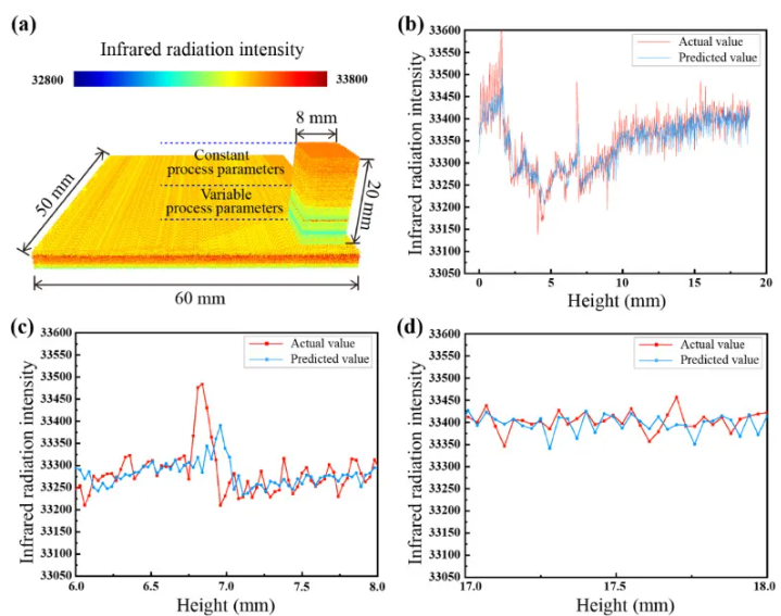 为了验证其在不同材料中的适用性,直接应用基于316L不锈钢实验数据训练的GRU来预测DZ125镍基高温合金的IIRI。本研究在单晶基板上制备了一个高度为20mm的矩形试样。相应IIRI序列特征的三维分布如图7(a)所示。该组件收集不同条件下的实验数据。在达到10mm的成形高度之前,激光功率和扫描速度是连续变化的,而在成形高度超过10mm之后,激光参数是固定的。这种可变参数的成形过程导致了层间序列特征的波动。如图7(b)所示,直到成形高度超过10mm,层序特征的总体趋势才稳定下来。