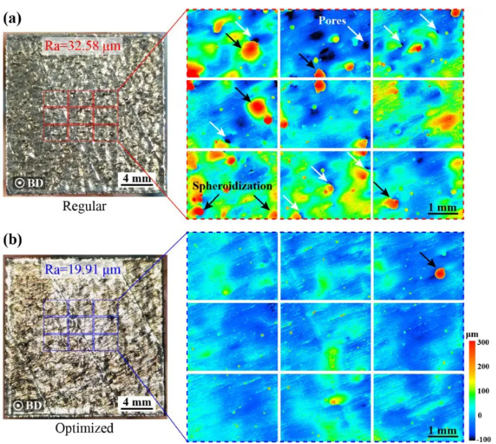 为了尽量减少局部变化对整体结果的影响,选择了优化和规则截棱锥组件顶面上的九个区域来确定表面质量,如图9所示。在常规样品的顶面上,观察到许多高度高达300μm的球形突起和向内延伸的孔。大多数孔分布在球形突起周围,这是由于顶面上的IHA效应引起的过烧现象造成的。过高的激光能量密度和粉末床温度会加速熔池内的流体流动,导致表面张力驱动的球化和不规则球形凸起的表面质量差。当激光能量密度过高时,蒸汽羽流会导致大量熔融飞溅物附着在样品表面。同时,气体可能被熔池内的湍流夹带,导致冷却时形成孔隙。这些孔显著降低了部件的相对密度和机械性能。过高的温度也会导致材料蒸发,从而导致某些元素的损失和烟雾的产生,这不仅会损害零件的成型质量,还会对设备和操作环境产生负面影响。此外,过烧可能会改变预定义的熔化路径,导致实际样品和3D模型之间的尺寸偏差,并降低几何精度。如图9(a)所示,IHA引起的过烧导致表面粗糙度显著增加,并形成影响部件性能的缺陷。相比之下,使用IIRI预测模型优化的样品表面在球化或空隙方面没有表现出明显的缺陷,如图9(b)所示。规则和优化部件的表面粗糙度(Ra),按九个区域的平均值计算,分别为32.58μm和19.91μm。根据预测的IIRI值实时动态调整工艺参数,以确保粉末完全熔化,同时避免过烧。这有效地提高了竣工样品的表面质量,从而得到更致密、更光滑的表面。
