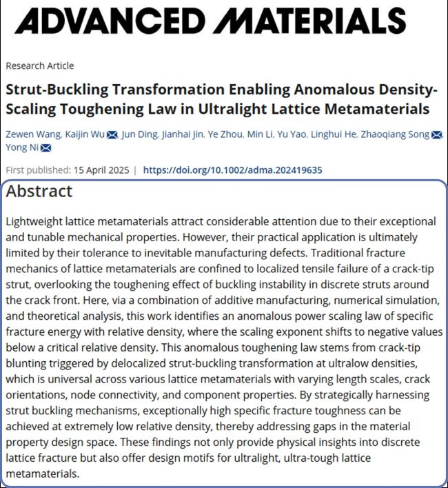 - 研究成果以题为 “Strut-Buckling Transformation Enabling Anomalous Density-Scaling Toughening Law in Ultralight Lattice Metamaterials” 发表于《Advanced Materials》上。中国科学技术大学Zewen Wang 为论文第一作者,Kaijin Wu、Zhaoqiang Song 和 Yong Ni 为论文共同通讯作者。