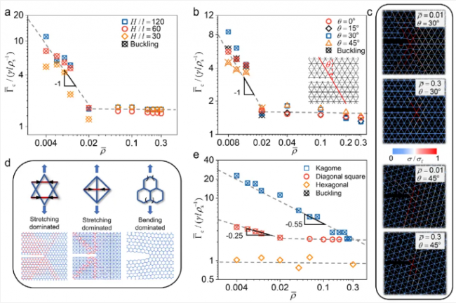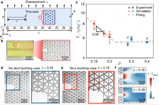 - 创新点:揭示支柱屈曲诱导裂纹尖端钝化导致的反常密度缩放增韧规律,突破传统认知,为轻质高韧性晶格超材料设计提供新思路。